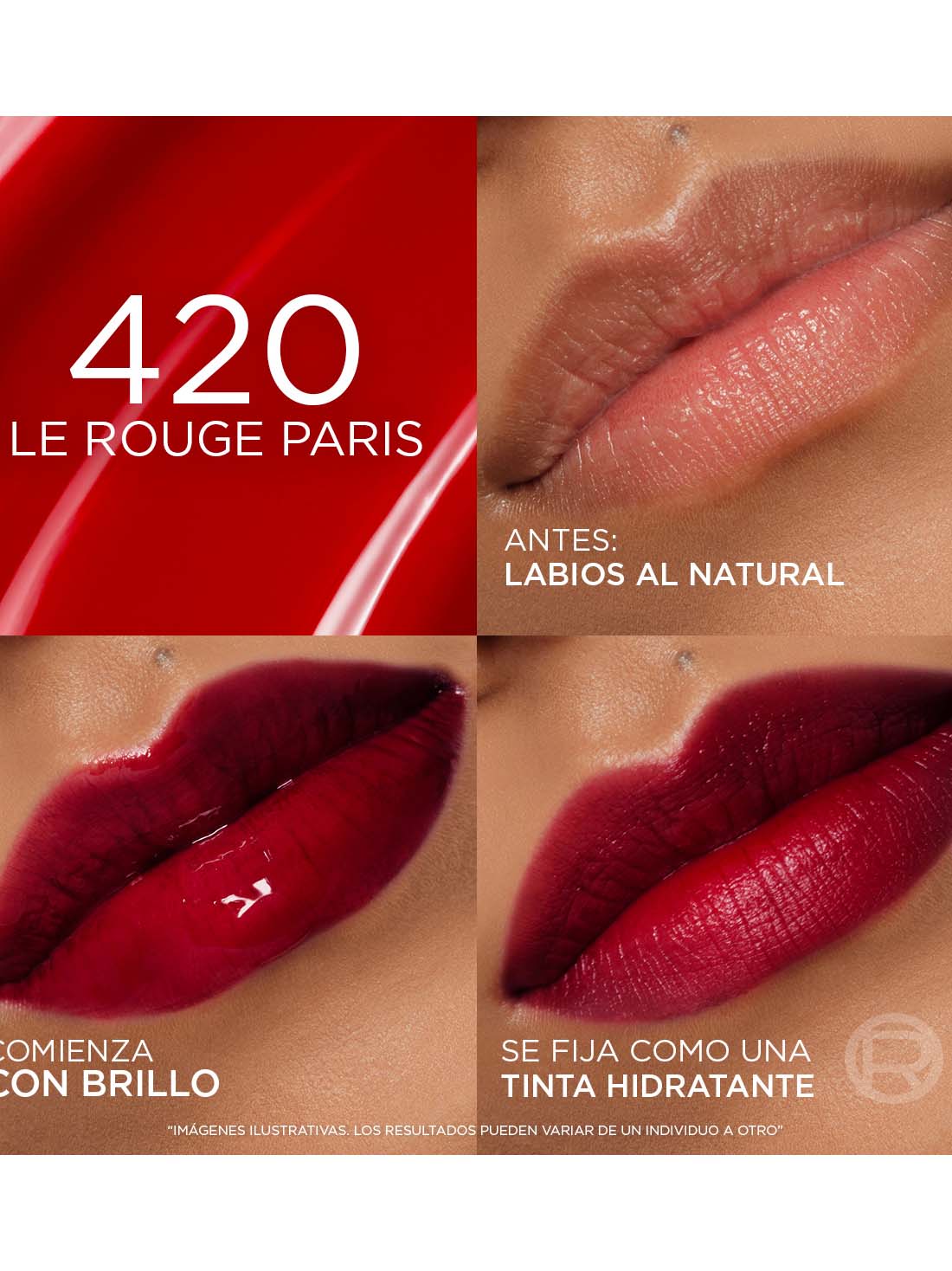 - Acabado inicial glossy y brilloso que a lo largo del día deja los labios pigmentados e hidratados