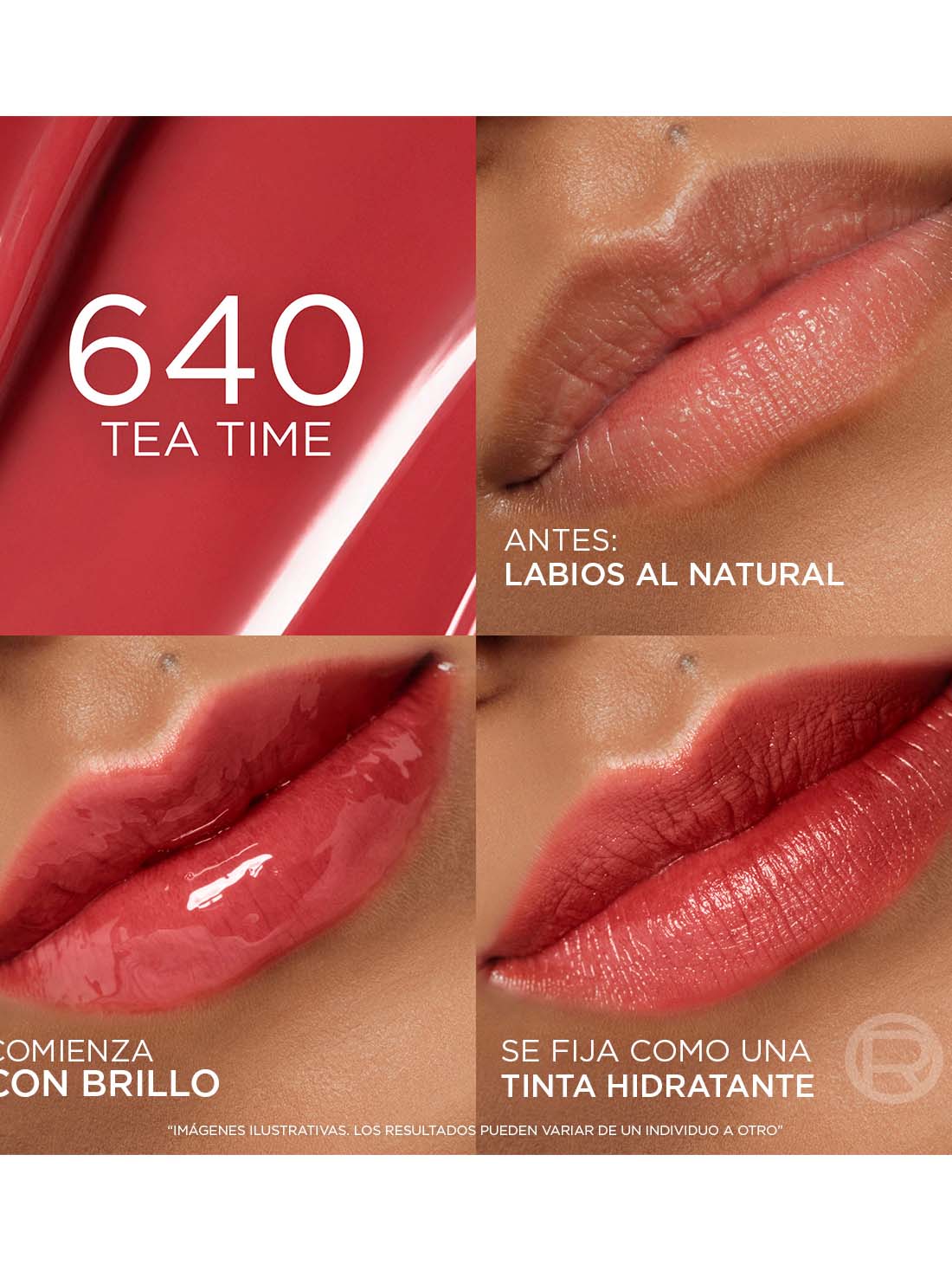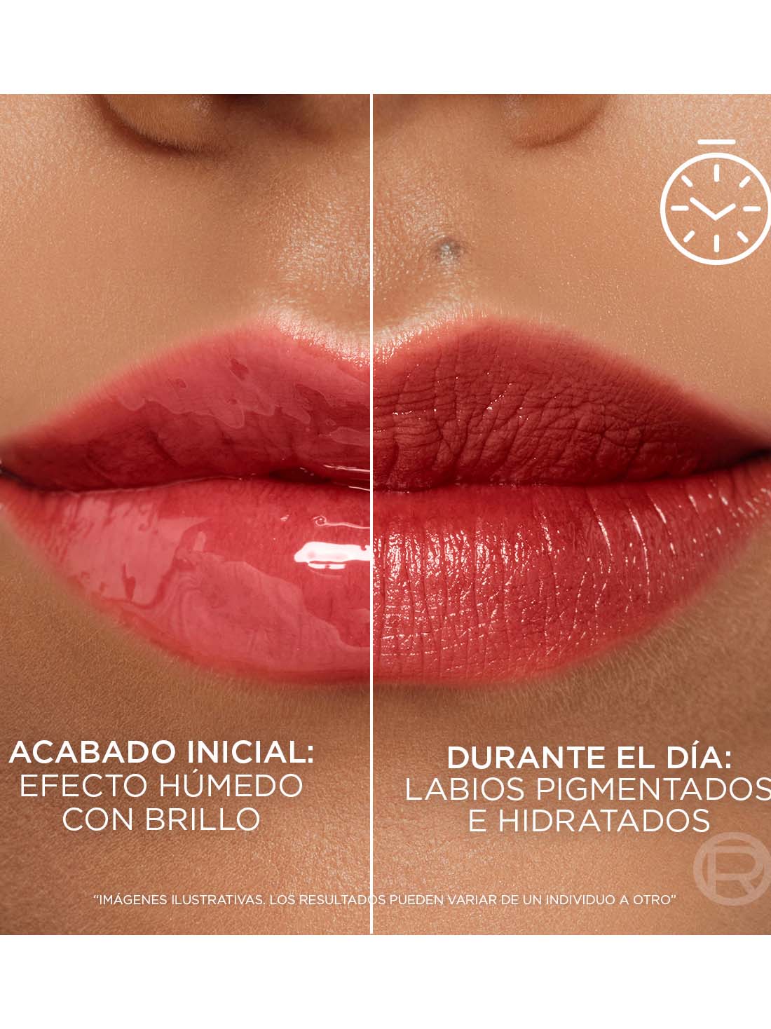 - Acabado inicial glossy y brilloso que a lo largo del día deja los labios pigmentados e hidratados