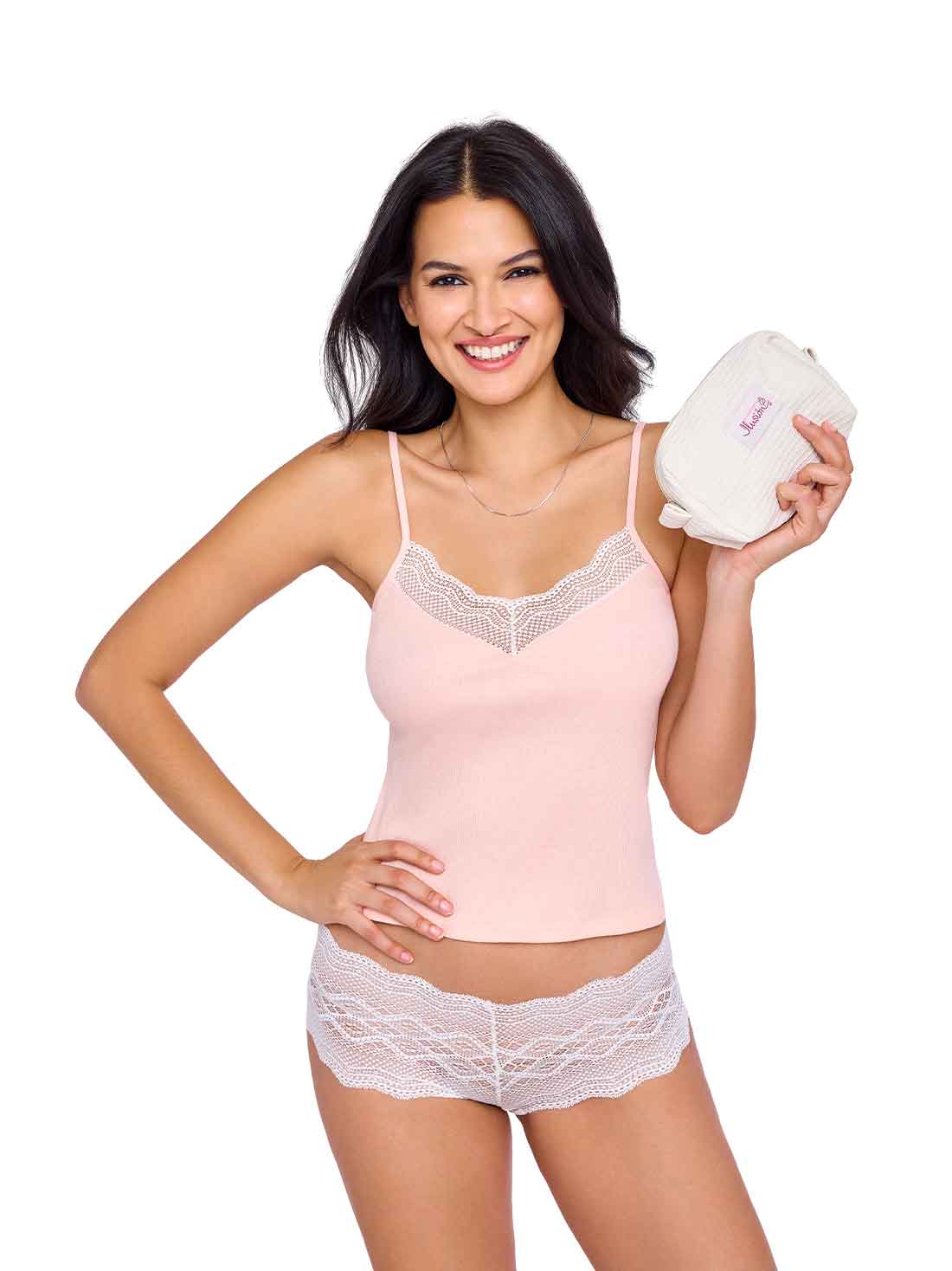 Regálale a mamá un momento de descanso con este set que incluye top y panty con encaje, más una cosmetiquera ideal para su día a día. Su tejido suave tipo rib y el ajuste perfecto la harán sentirse cómoda, femenina y llena de amor.