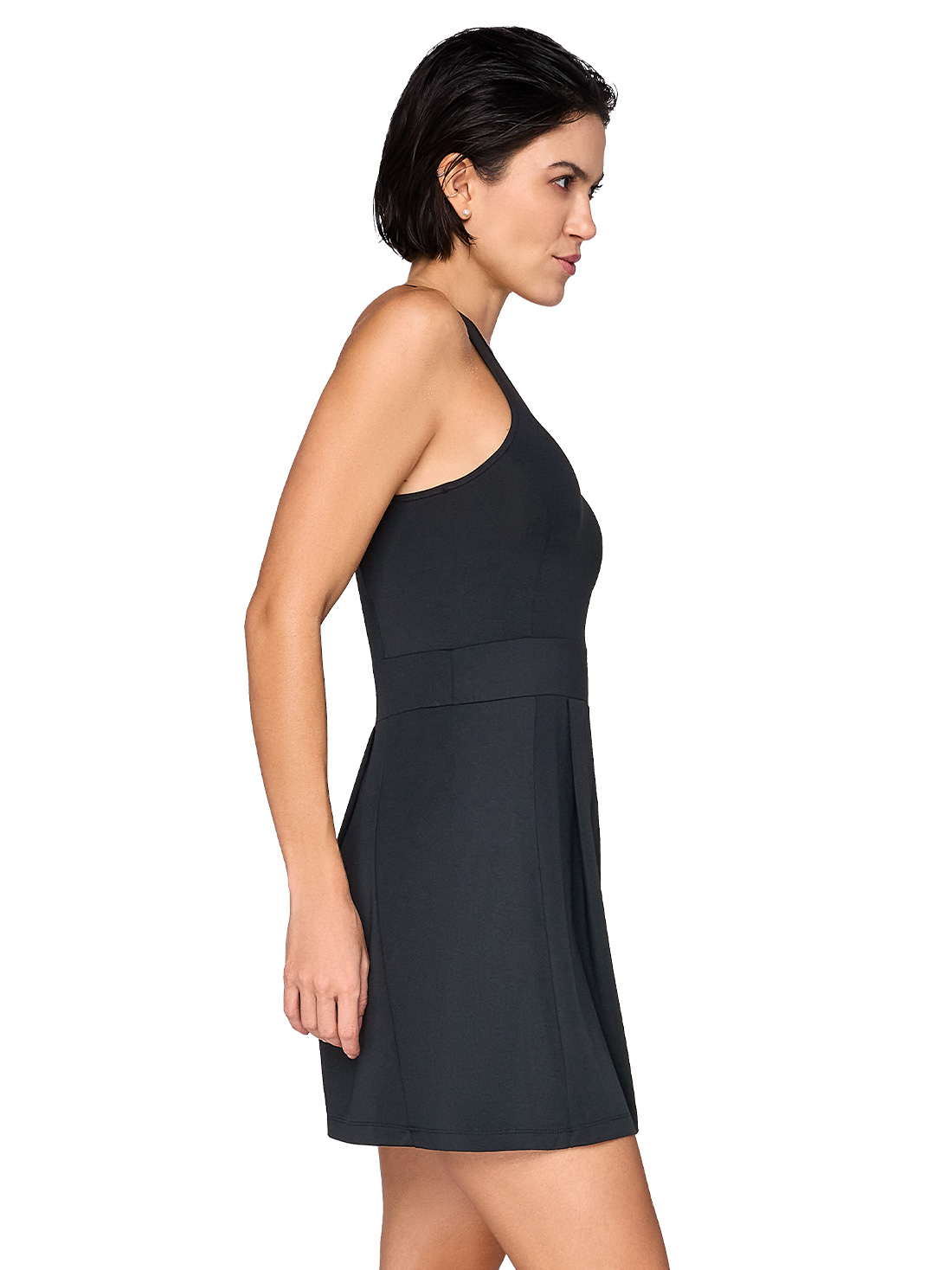 Vestido deportivo con espalda racerback y cortes que estilizan tu figura. Su falda con tablones permite mayor movimiento, mientras su tejido transpirable y de secado rápido lo hace ideal para actividades físicas o looks dinámicos.