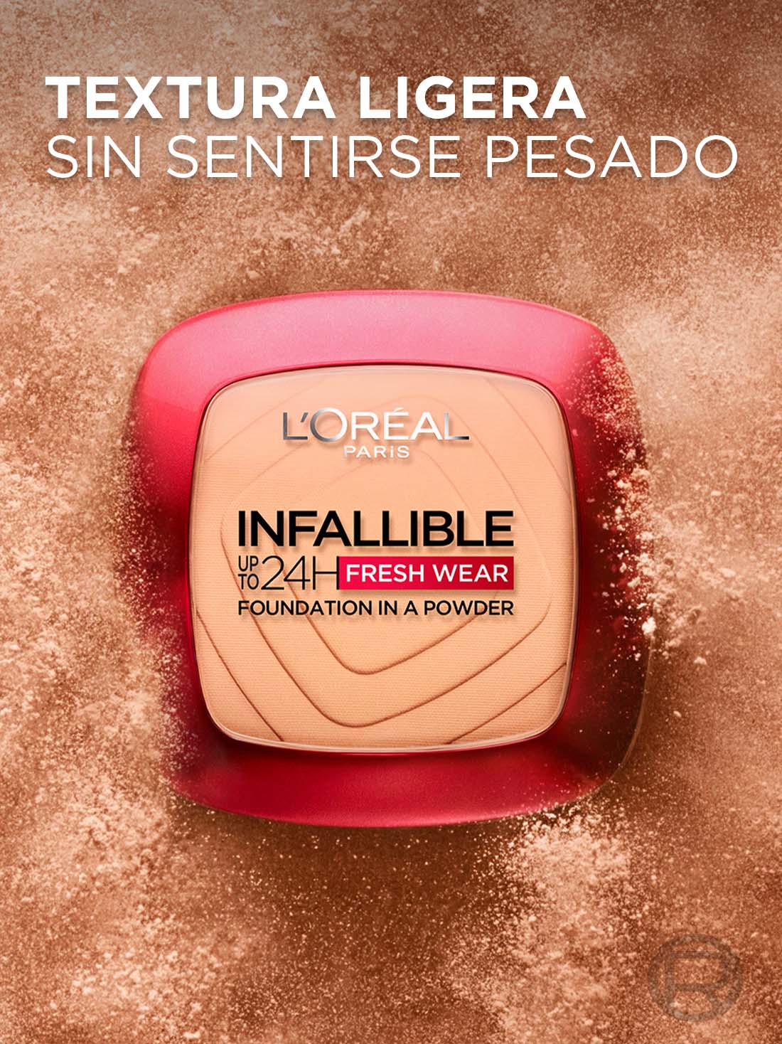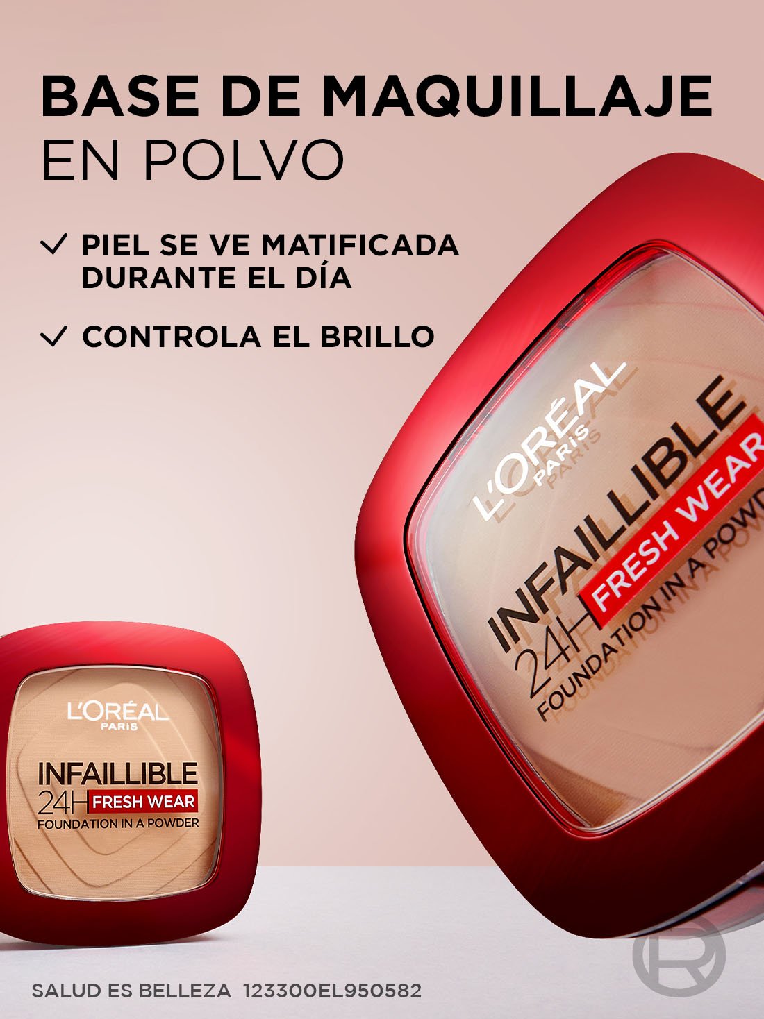 - Base de maquillaje en polvo de alta cobertura y acabado mate. Larga duración de hasta 24 hrs