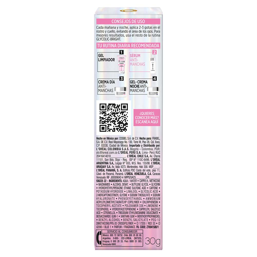 - Sérum anti manchas formulado con niacinamida y ácido glicólico, ingredientes que ayudan a reducir manchas y unificar el tono de la piel