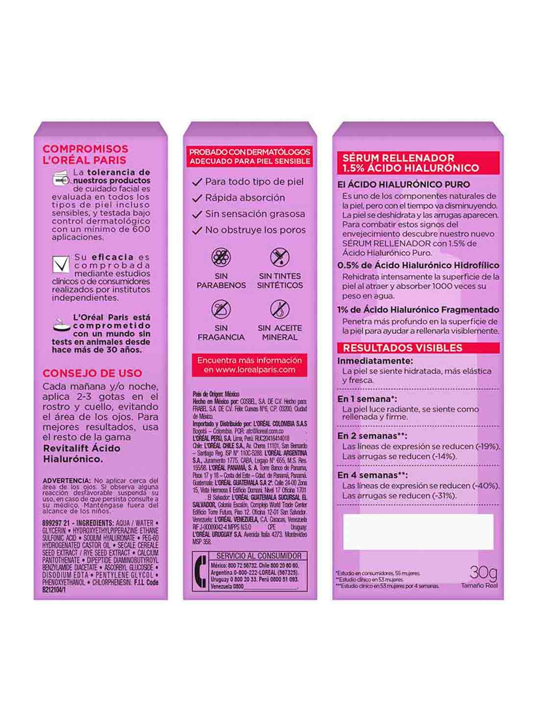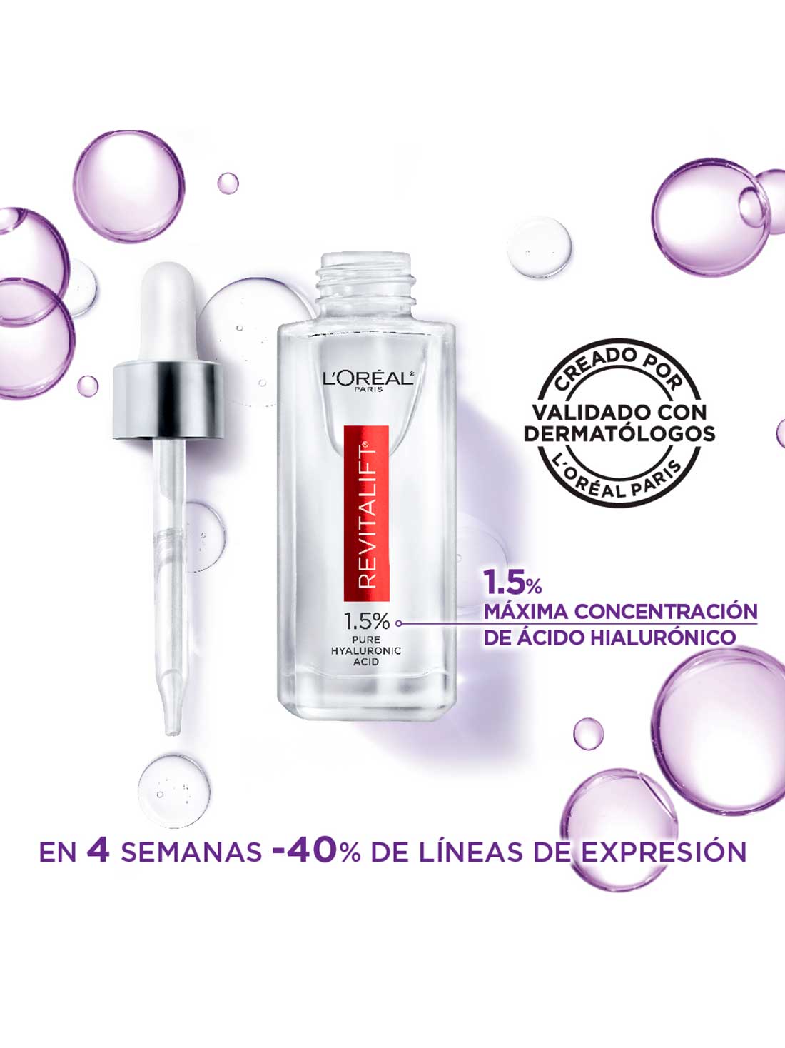 - Suero con mayor concentración de Ácido Hialurónico que penetra profundamente en las capas de la piel para rellenar la líneas de expresión