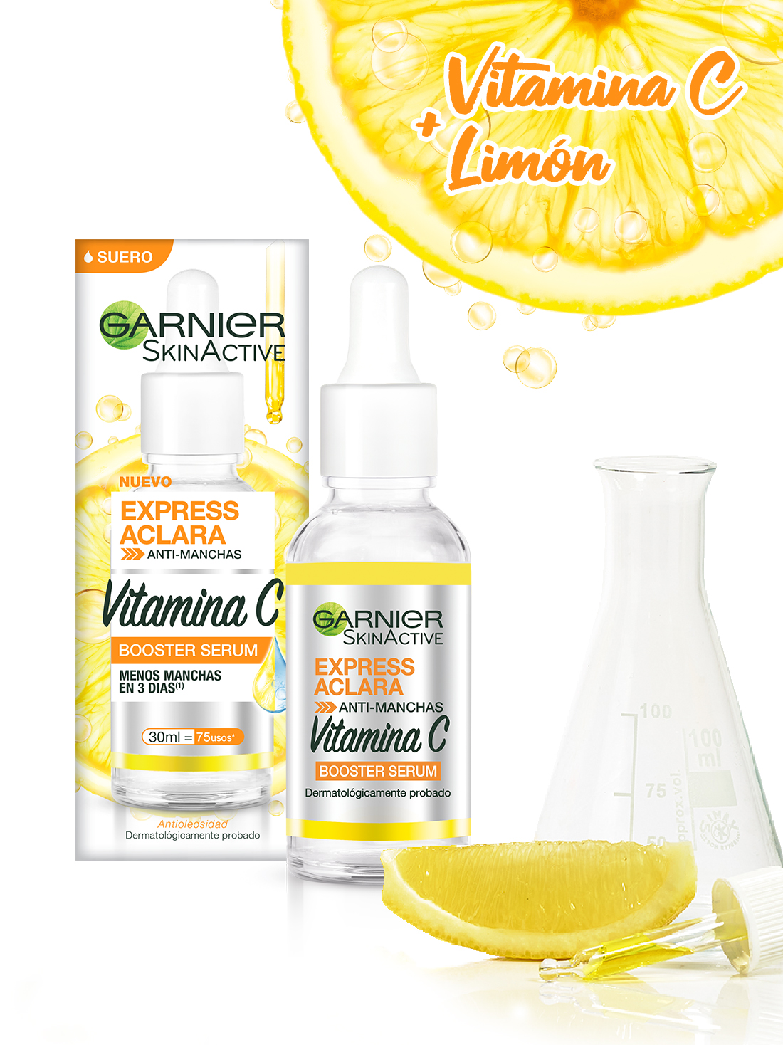 - Concentrado en Vitamina C, extracto de limón y ácido salicílico deja una piel visiblemente uniforme en 3 días