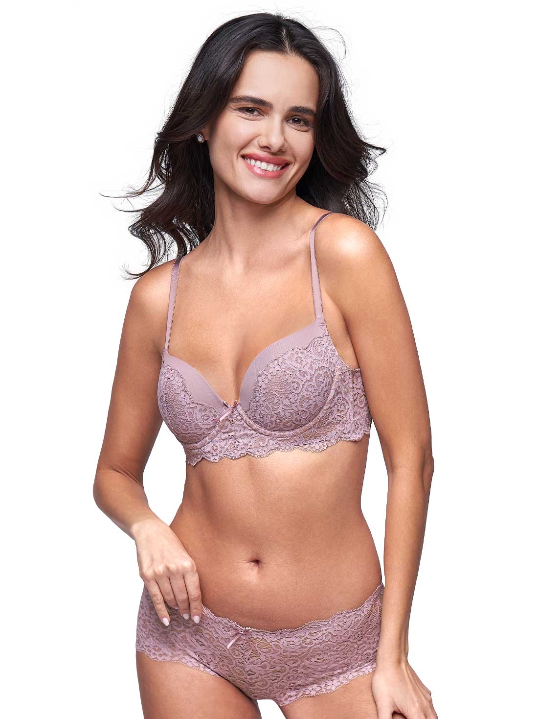 Este bra de encaje combina elegancia y funcionalidad. Su copa escotada realza tu busto sin relleno, mientras que el torso ancho y varilla lateral te dan estabilidad. Perfecto para sentirte segura y femenina en cualquier ocasión.