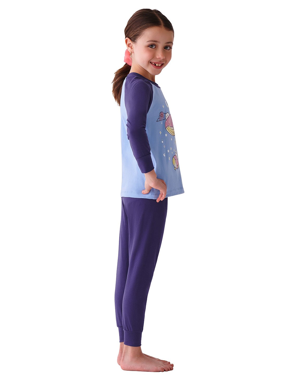 Set de Pijama con manga larga y pantalón, con cómodo elástico en la cintura y puños ajustados en las mangas para un ajuste perfecto. El divertido estampado con brillos y el contraste de colores te aseguran un descanso lleno de estilo.