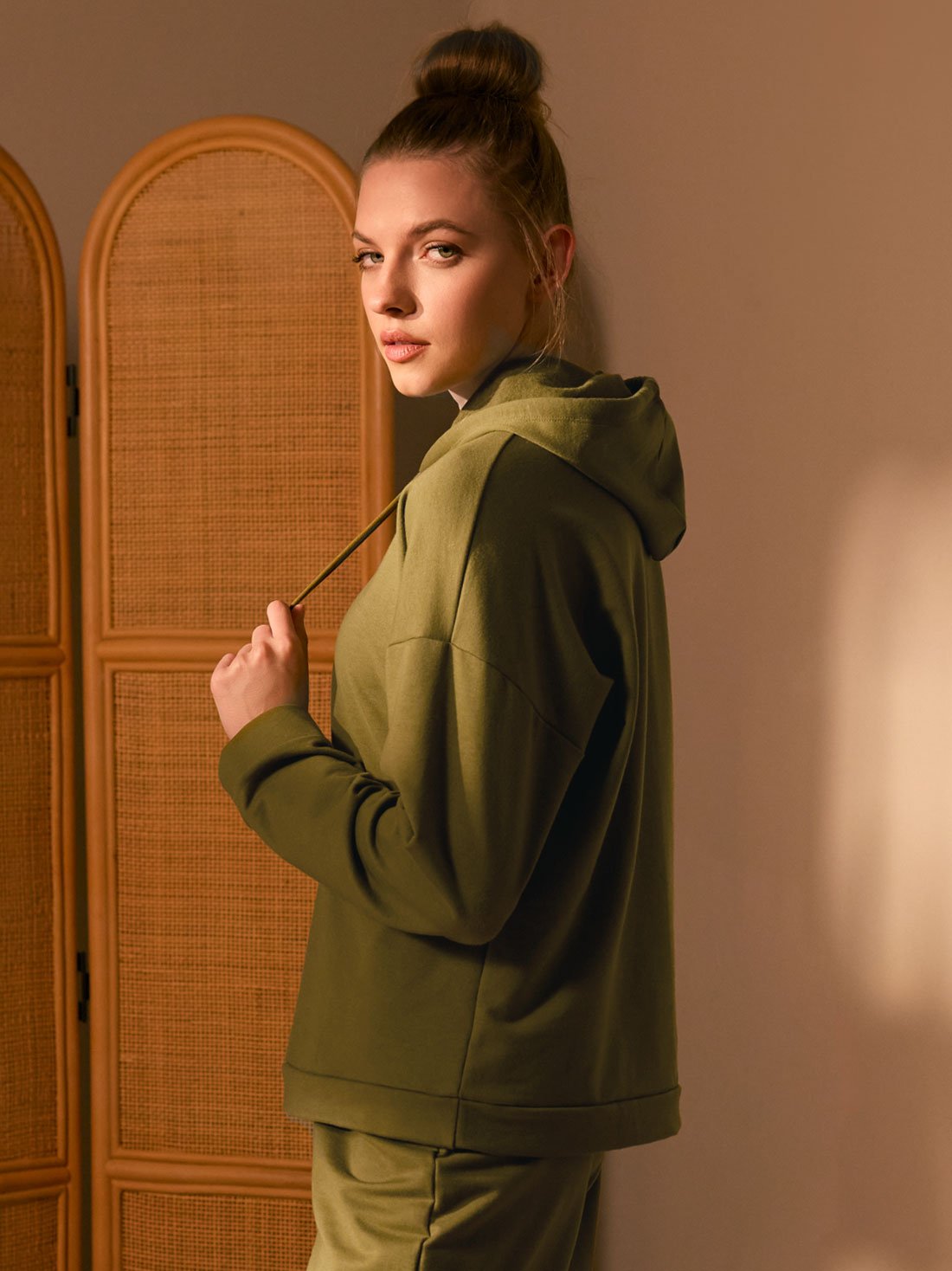 Esta sudadera con capucha es ese abrazo suave que necesitas en días frescos. Su interior afelpado te mantiene calientita, mientras que la silueta holgada y el largo a la cadera te dan libertad para moverte con comodidad.
